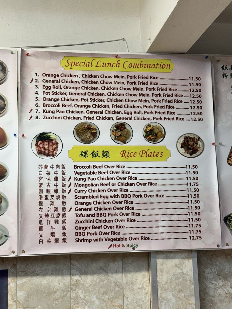 Orange Chicken, Pot Sticker, Chicken Chow Mein, Pork Fried Rice